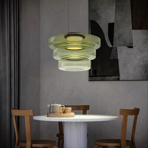 Laat je interieur baden in zachte, gelaagde gloed met deze unieke Bauhaus hanglamp van gekleurd glas. Elk element van dit designstuk is een harmonie tussen kunst en functie, met zijn transparante glasstructuren die als zwevende schijven het licht op poëtische wijze breken en verspreiden.