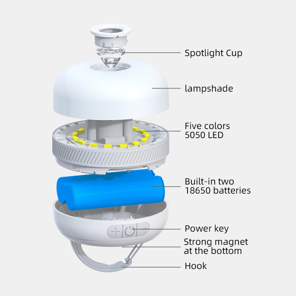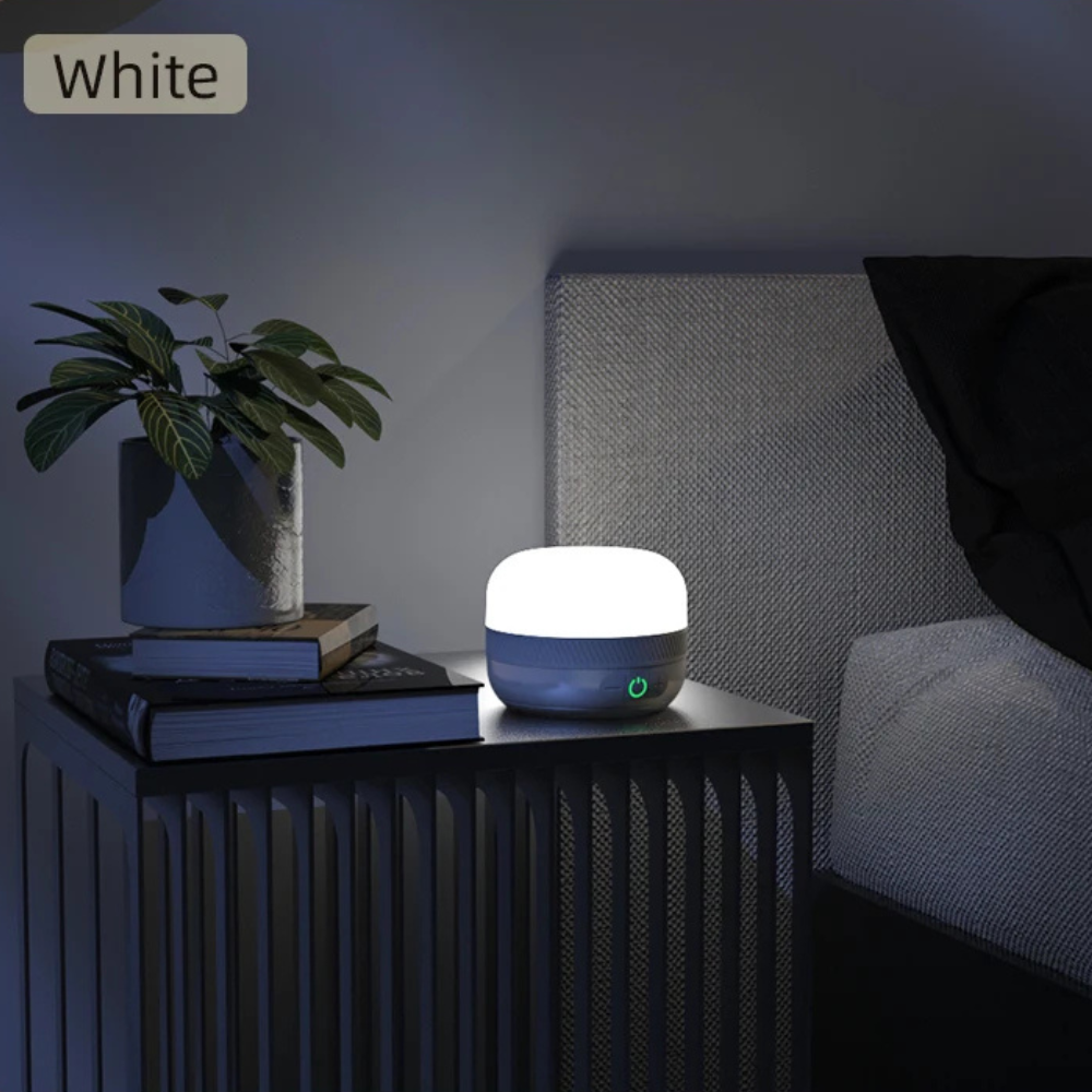 Laat je betoveren door deze oplaadbare camping tafellamp die design, functionaliteit en sfeer moeiteloos combineert. Met zijn compacte, elegante vorm en zachte lichtverspreiding is deze lamp een stijlvolle metgezel – of je nu ontspant in de woonkamer of de natuur verkent.