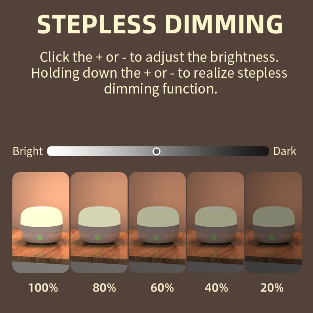 Pas de helderheid moeiteloos aan via de + en - toetsen of houd ingedrukt voor vloeiende overgang. Van zacht nachtlampje tot fel werklampje. -