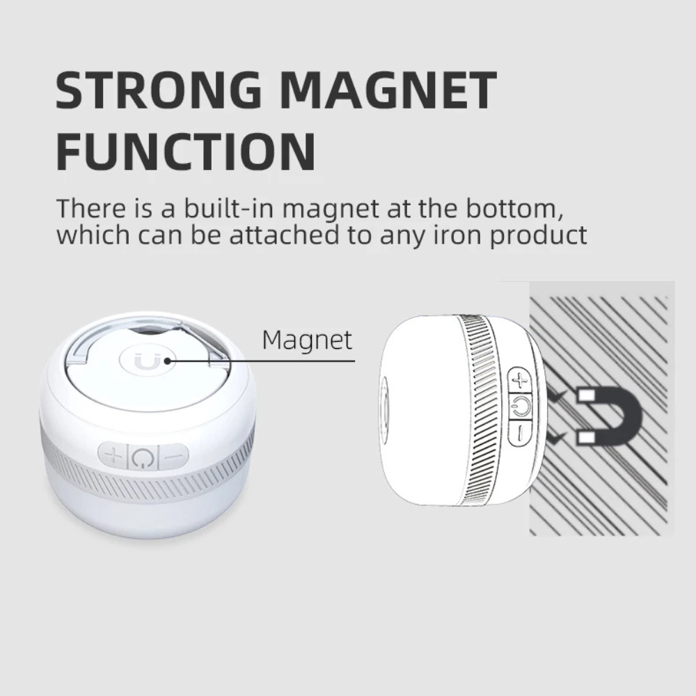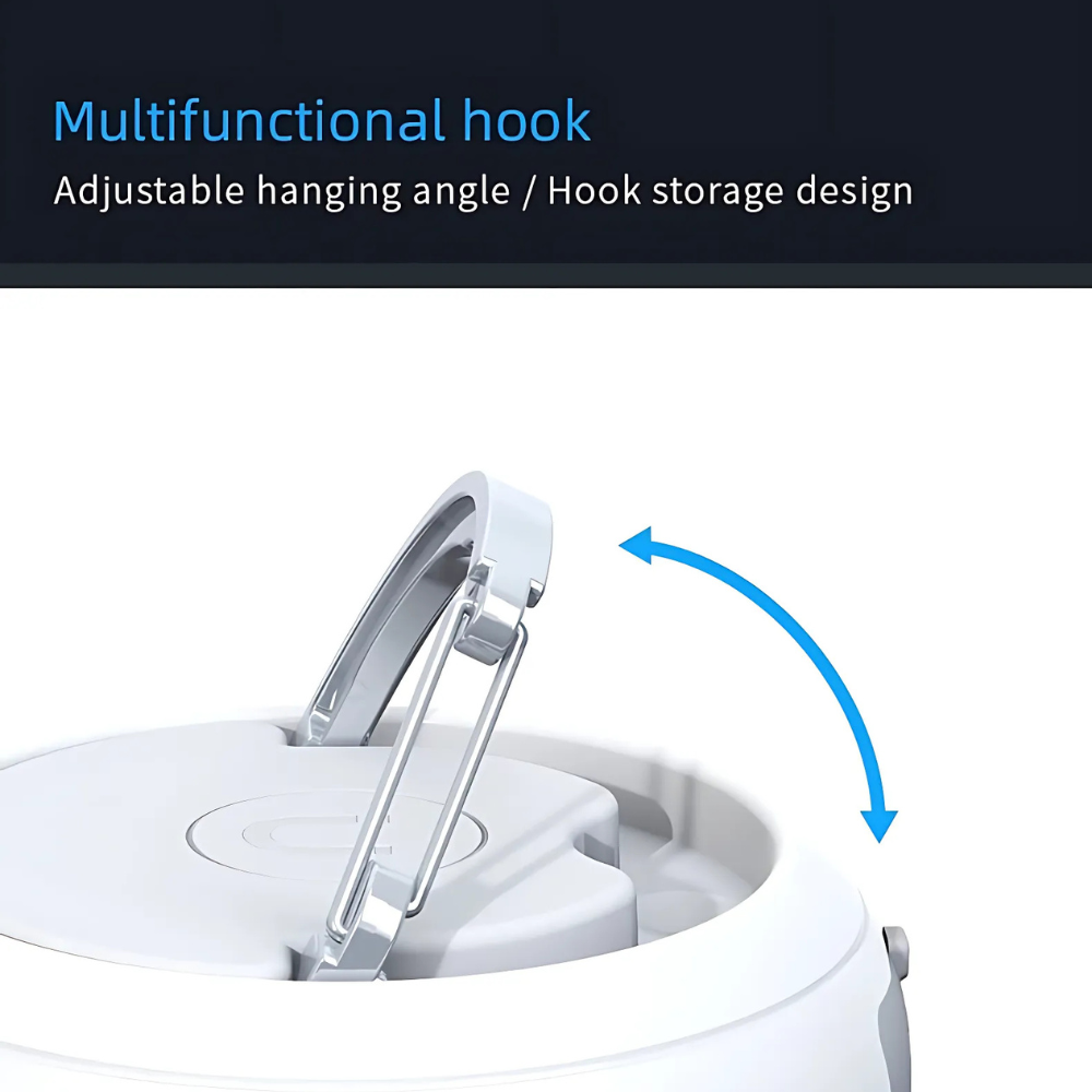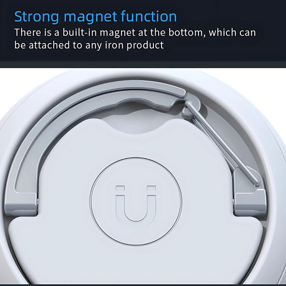 Draagbaar, oplaadbaar via USB-C, met ophanghaak én een sterke magneet aan de onderzijde voor bevestiging aan metalen oppervlakken. -