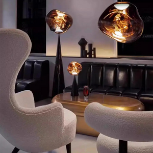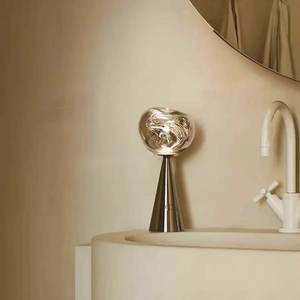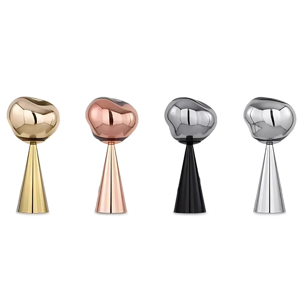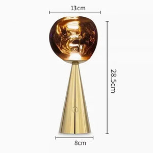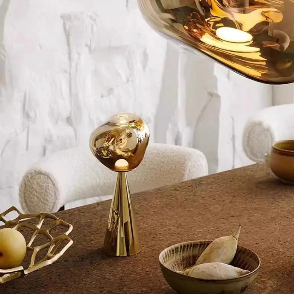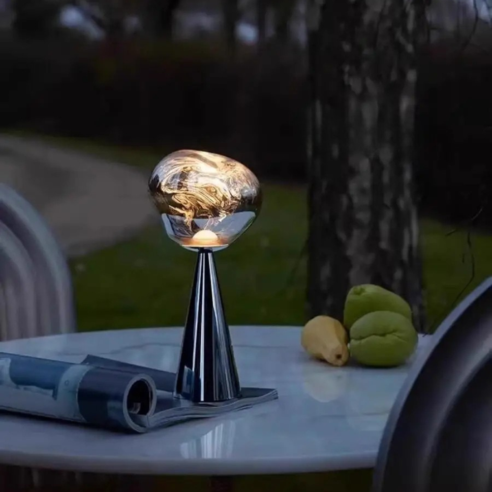 Laat je betoveren door de unieke vormgeving van deze design tafellamp, waarin een gesmolten glazen bol rust op een elegante metalen kegel. Het licht weerkaatst speels in het glas en creëert een gloed die je zintuigen kalmeert en je ruimte verrijkt.