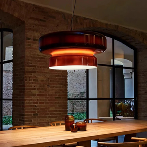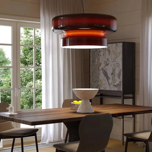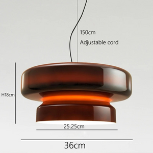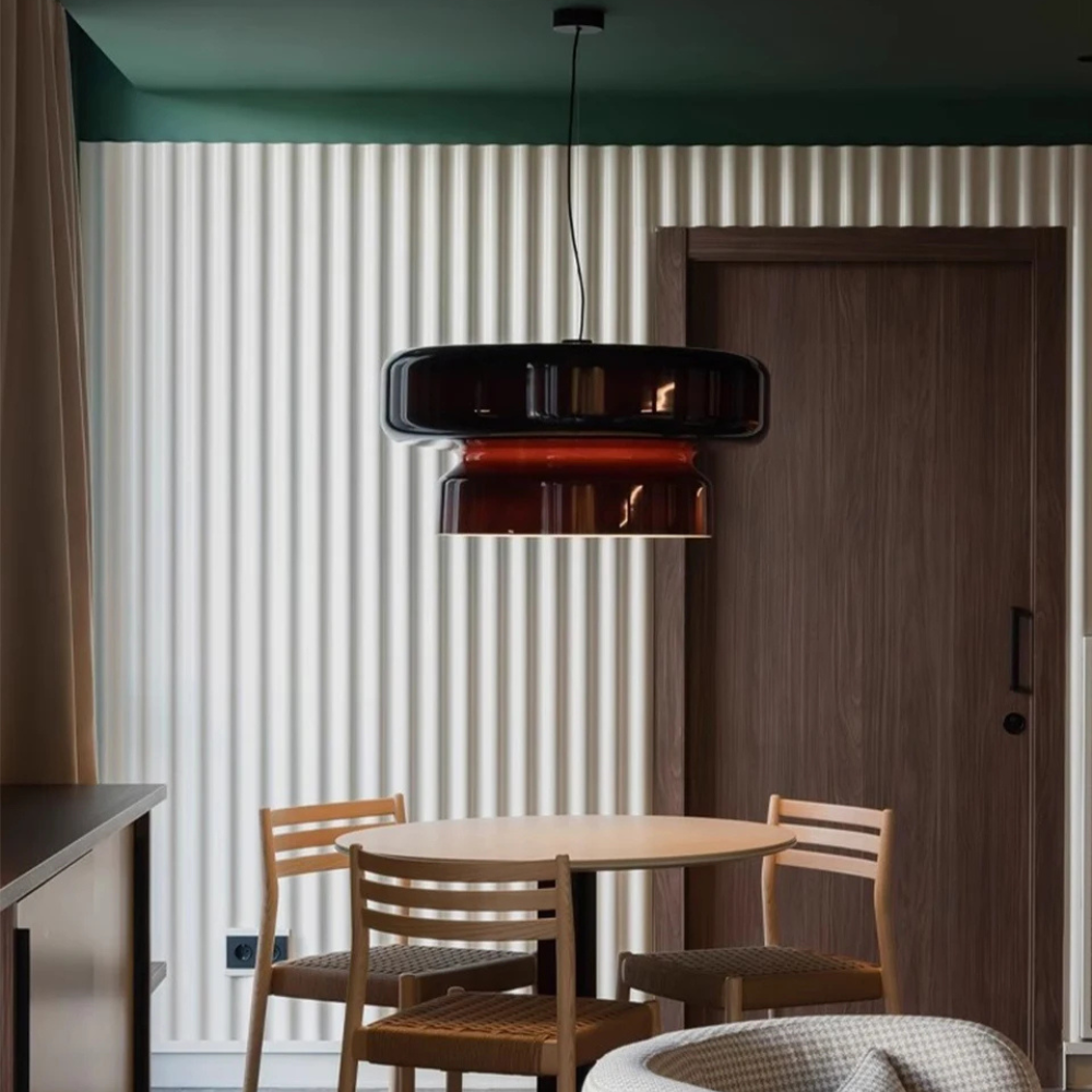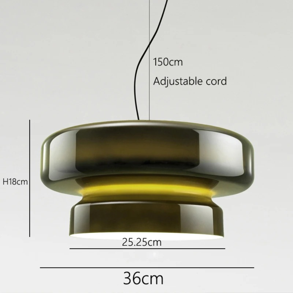 Laat je interieur stralen met de Gelaagde hanglamp, een verfijnd samenspel van glas en licht. Met zijn unieke lagenstructuur en rijke kleuren zoals amber, groen of paars, brengt deze hanglamp een warme en uitnodigende gloed in elke ruimte.