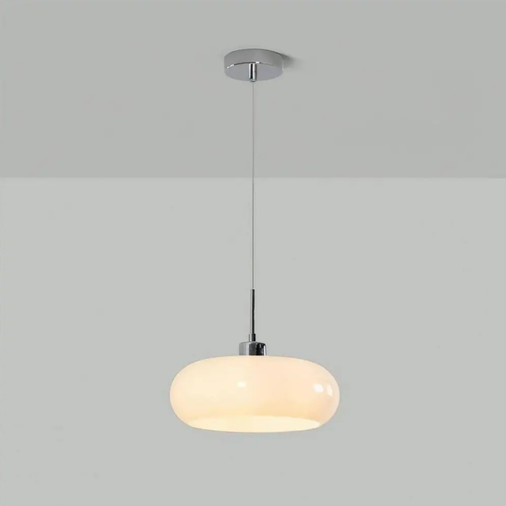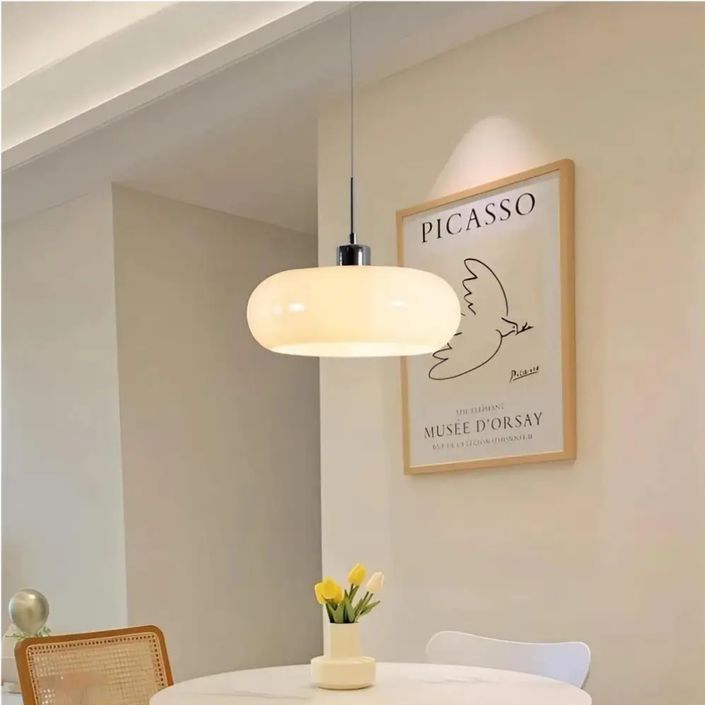 De matte glazen kap verspreidt het licht gelijkmatig en zorgt voor een warme, uitnodigende ambiance. -