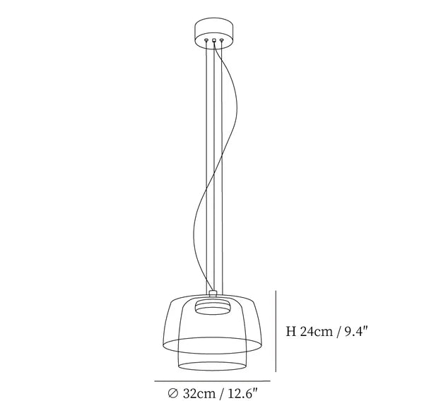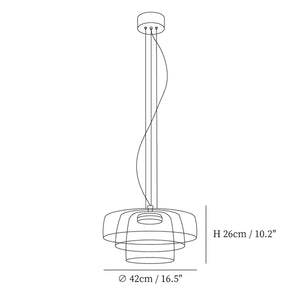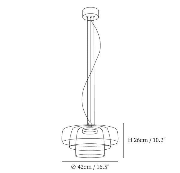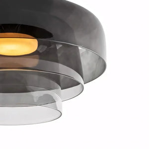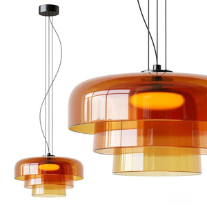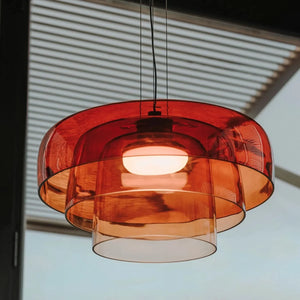 Verlicht jouw ruimte met karakter dankzij deze glazen hanglamp met elegante, overlappende lagen. De transparante kap in groen, oranje of rookgrijs filtert het licht op subtiele wijze, waardoor een warme, uitnodigende sfeer ontstaat in jouw interieur.