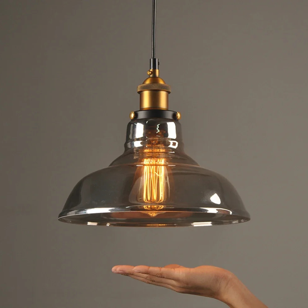 Laat je betoveren door de Hanglamp Industrieel Glas, een verfijnde combinatie van robuust industrieel design en subtiele charme. De met zorg vervaardigde glazen kap in smoke grey kleur verspreidt een zachte, warme gloed die elke ruimte een uitnodigende sfeer geeft.