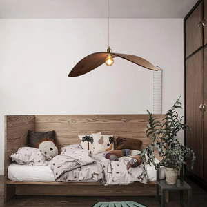 Laat je interieur stralen met de Hanglamp walnoot hout, een meesterwerk van minimalistisch design en natuurlijke elegantie. Met zijn vloeiende lijnen en walnootkleurige houten vleugels brengt deze hanglamp warmte en karakter in elke ruimte. Het subtiele contrast tussen het donkere hout en de messingkleurige fitting creëert een tijdloos en harmonieus geheel.