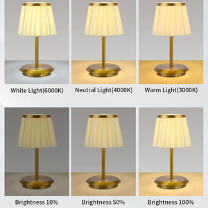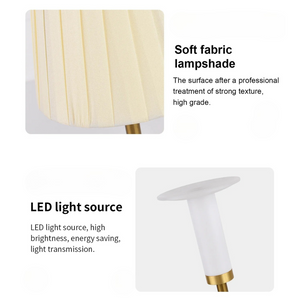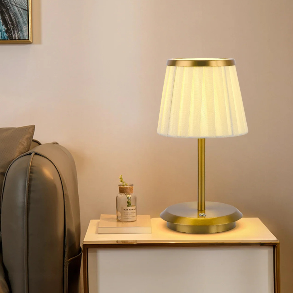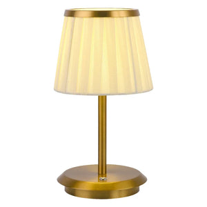 Breng een vleugje verfijning in jouw interieur met deze hotel chique tafellamp op batterij. De combinatie van een zachte geplooide stoffen kap, een elegante gouden voet en geïntegreerde LED-verlichting creëert een luxueus statement in elke ruimte.