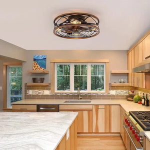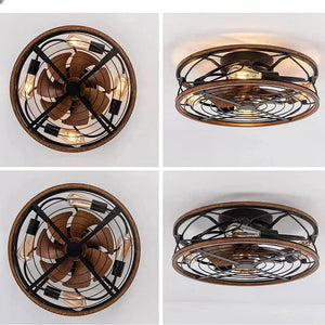 Laat jouw interieur tot leven komen met deze industriële ventilator plafondlamp – een meesterwerk dat verlichting en ventilatie naadloos combineert in één verfijnd design. De robuuste metalen kooi, afgewerkt met warme houtaccenten, omhult een krachtige ventilator en sfeervolle E27-lichtbronnen voor een stijlvol statement aan je plafond.