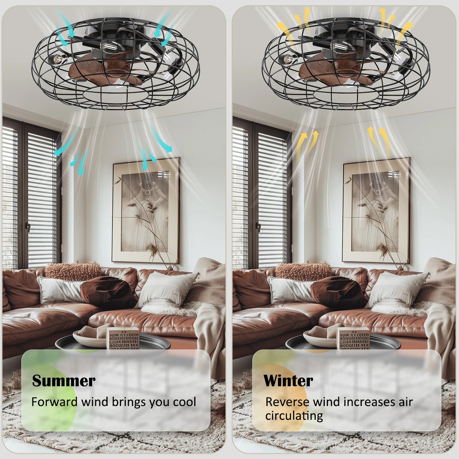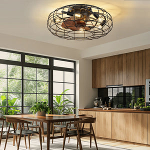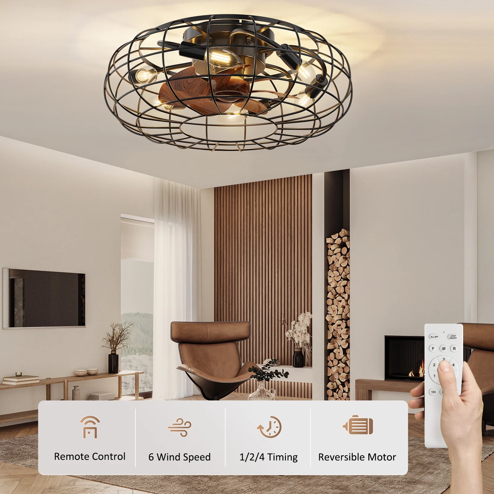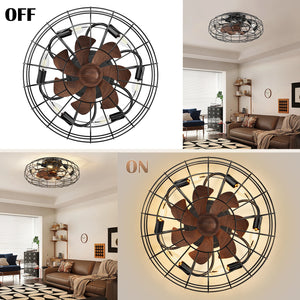 Laat jouw ruimte tot leven komen met deze industriële ventilator plafondlamp met afstandsbediening — een stijlvol samenspel van robuust metaal, warme houttonen en moderne technologie. Achter het elegante kooiontwerp gaan zes lichtpunten en zeven retro bladen schuil, klaar om jouw interieur met licht en lucht te verrijken.