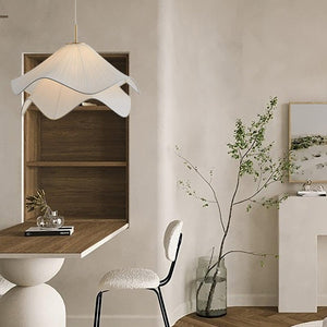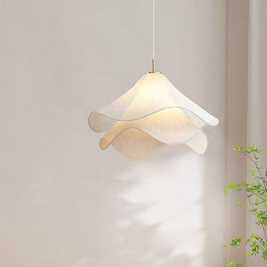 Creëer een oase van rust in huis met deze Japandi hanglamp voor de woonkamer, een luchtige en sculpturale verschijning die zweeft als een bloem in volle bloei. De lampenkap van geplooide stof vouwt zich in zachte golven en verspreidt een warme, diffuse gloed die elke ruimte tot leven brengt.