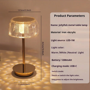 Laat je betoveren door de verfijnde schittering van deze oplaadbare kristallen tafellamp in goud. Met haar glazen kap die licht in fonkelende patronen verspreidt en haar elegante metalen voet, brengt ze een vleugje luxe in elk interieur.