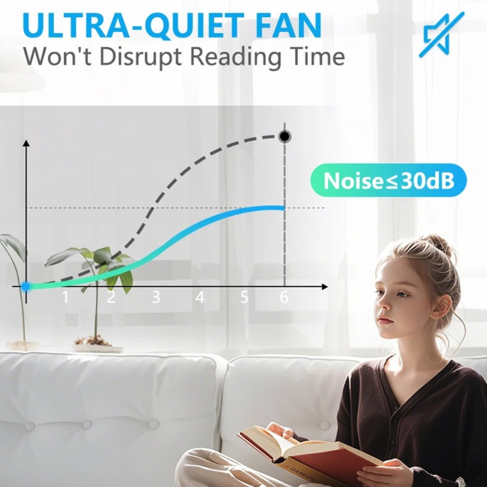 Geniet van fluisterstille luchtcirculatie dankzij de krachtige DC-motor met zes standen, van slaapstand tot sportmodus. -