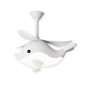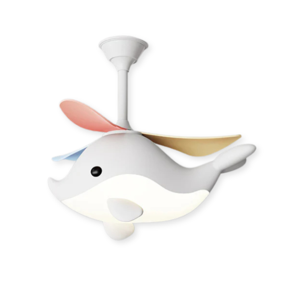 Laat je kind wegdromen onder het rustgevende licht en de zachte luchtstroom van deze unieke walvisvormige plafondventilator. Een betoverend ontwerp dat functionaliteit combineert met speelse elegantie – speciaal ontworpen voor een serene en veilige kinderkamer.