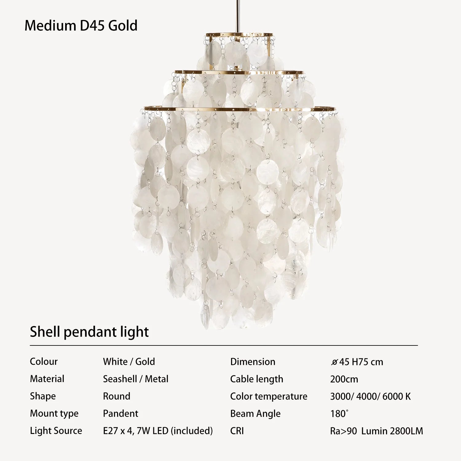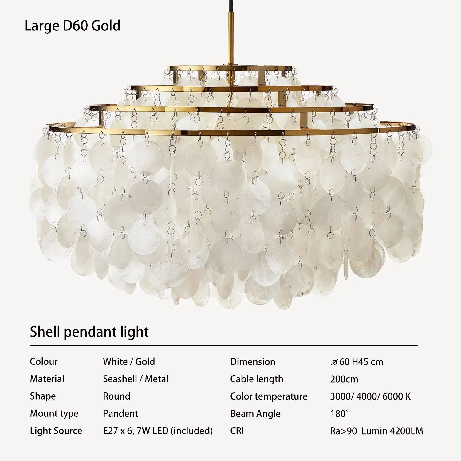 Laat je betoveren door de unieke schoonheid van de Schelpen hanglamp, waar natuurlijke schelpen en glanzend metaal samenkomen in een verfijnd design. Deze lamp verspreidt een zacht, diffuus licht dat elke ruimte omhult met warmte en elegantie.