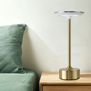 Laat je verleiden door de elegante eenvoud van deze oplaadbare tafellamp. Met een moderne metalen afwerking, subtiele rondingen en een discrete LED-ring die zacht oplicht bij aanraking, is dit meer dan een lamp—het is een stijlstatement.
