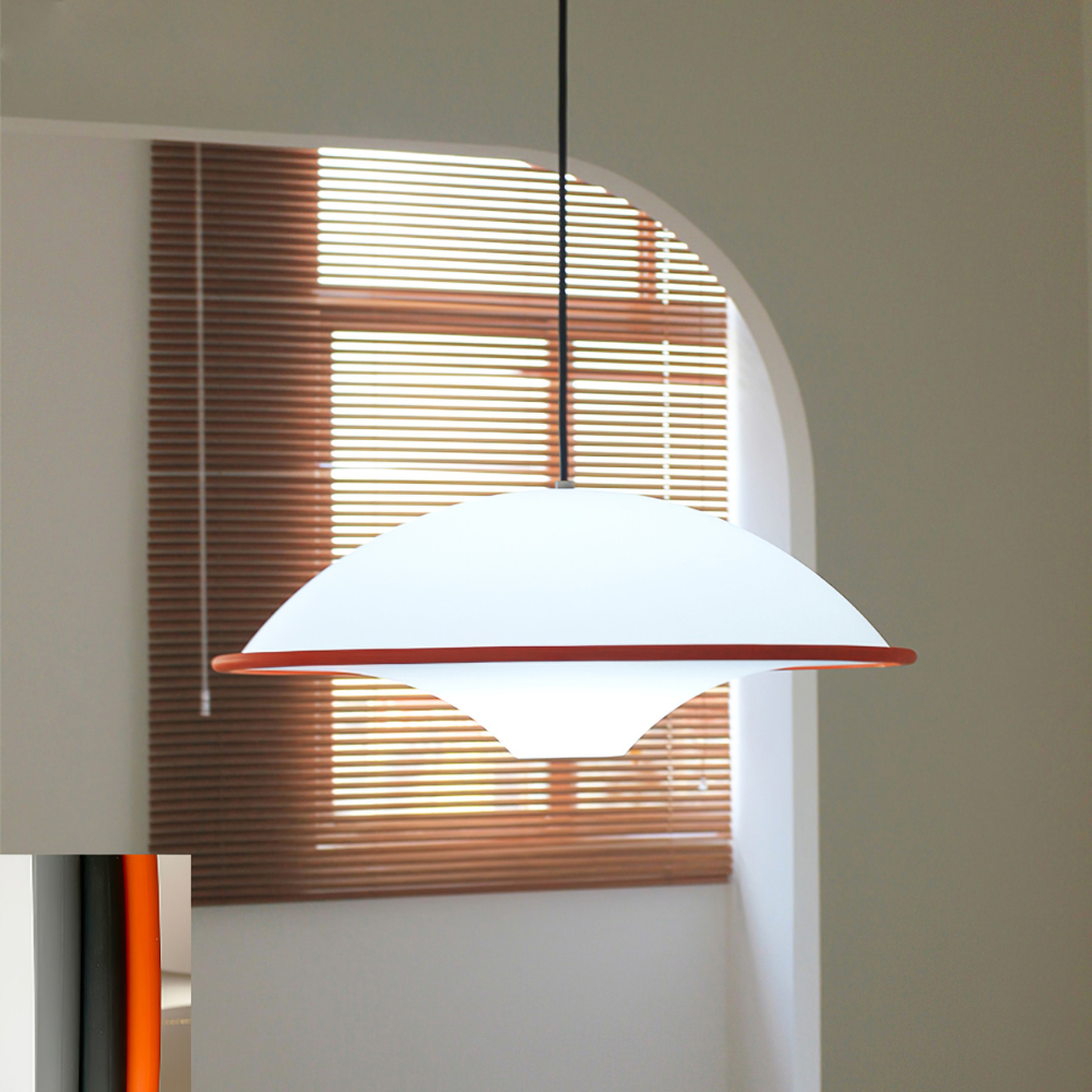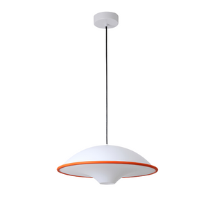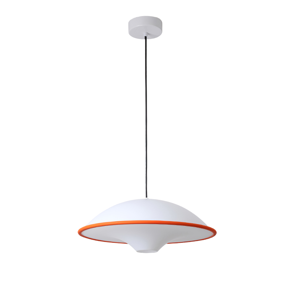 Laat je interieur stralen met de verfijnde Ufo hanglamp. Met zijn sierlijke lijnen en subtiele mix van wit acryl en oranje accenten brengt deze lamp een harmonie van vorm en functie in jouw ruimte. De warme lichtuitstraling zorgt voor een uitnodigende sfeer waar je elke dag van geniet.