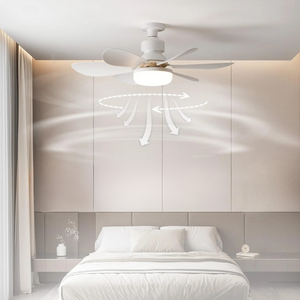 Laat je interieur ademen met deze moderne ventilator plafondlamp, ontworpen voor eenvoud, elegantie en efficiëntie. De zes verfijnde bladen ontvouwen zich als bloembladen en verspreiden zowel licht als een zachte luchtstroom door de kamer – allemaal bedienbaar met één druk op de knop.
